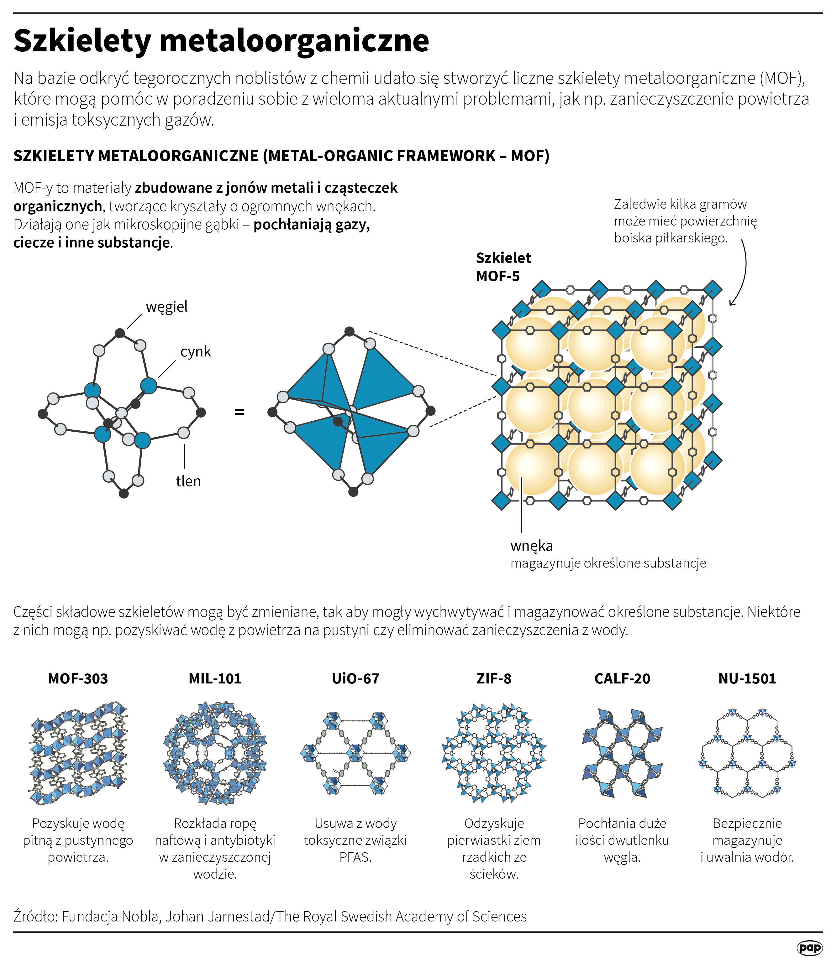 Tegoroczna Nagroda Nobla z chemii przypadła Susumu Kitagawie, Richardowi Robsonowi oraz Omarowi M. Yaghiemu - „za rozwój szkieletów metaloorganicznych”. Chodzi o nową architekturę molekularną materiałów zawierających wolne przestrzenie. Można je wykorzystać m.in. w usuwaniu toksycznych gazów czy magazynowaniu energii.