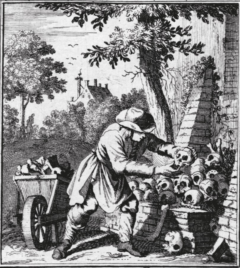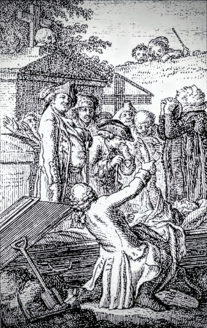 Ryc. Oględziny podejrzanego nieboszczyka ekshumowanego na cmentarzu. Repr. z: Taschenbuch für Aufklärer und Nichtaufklärer auf das Jahr 1791, Ber­lin 1791, za „Magia posthuma” D. Wojtucki