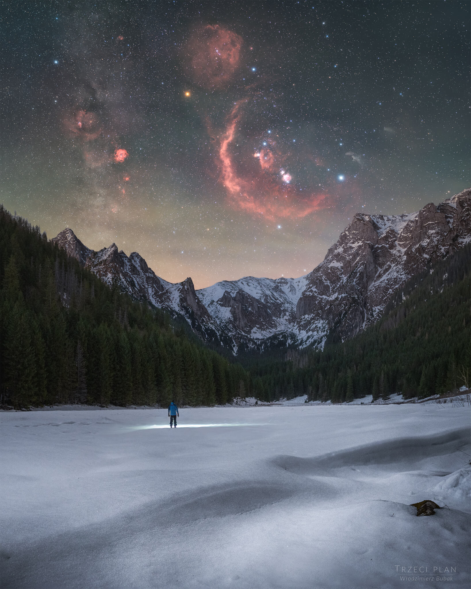 – Orion w Polsce jest najlepiej widoczny na zimowym niebie. Zależało mi na ośnieżonych szczytach, atrakcyjnym pierwszym planie oraz sylwetce człowieka w tle, która podkreśla skalę gór i ogrom kosmicznej przestrzeni. Dodatkowo trzeba było trafić na bezchmurną i bezksiężycową noc – dodał.