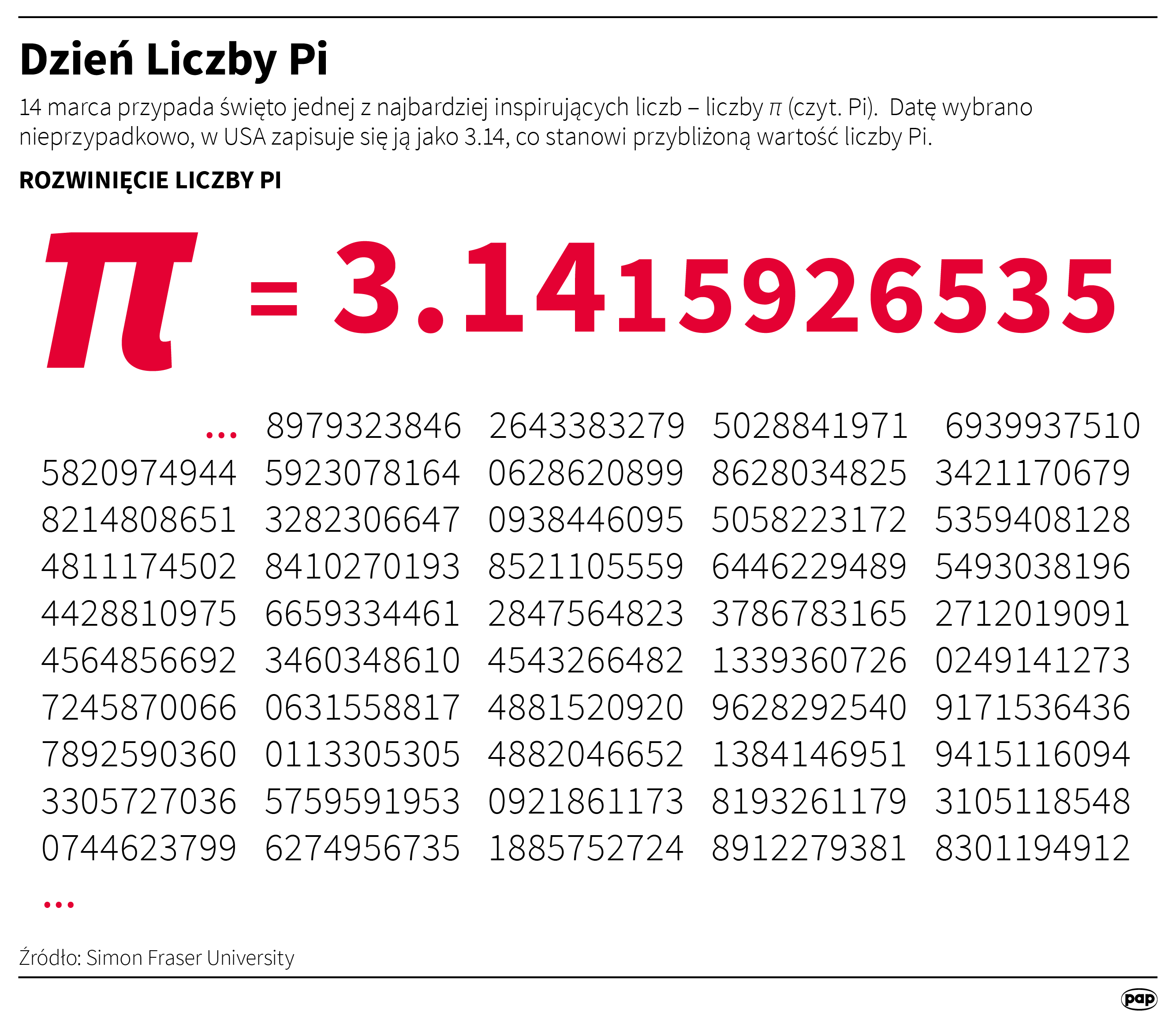 W grudniu ubiegłego roku amerykańska firma StorageReview ogłosiła, że jej pracownicy odkryli 314 bilionów znaków (bilion to milion milionów), co – oczywiście z pomocą komputera – zajęło im 110 dni. Wkrótce można liczyć na kolejne rekordy w tej kwestii, bowiem fascynacja Pi jest nieskończona, podobnie jak liczba jej cyfr po przecinku. (PAP)
