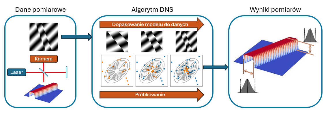 Końcowym wynikiem działania algorytmu są nie tylko estymowane wartości parametrów obiektu, ale również informacja statystyczna o ich niepewności. Dzięki temu, proponowane podejście umożliwia wiarygodną, ilościową analizę geometrii struktur nanofotonicznych, bez konieczności skanowania próbki czy akwizycji wielu interferogramów. Wyróżnia się także odpornością na szum i bardzo małe (generujące sub-pikselowe zmiany) wartości parametrów, np. wysokość falowodu może być na poziomie kilku nanometrów (w symulacjach nawet kilku Angstromów!).