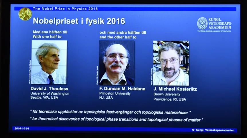 David J. Thouless, F. Duncan M. Haldane oraz J. Michael Kosterlitz otrzymali Nobla z fizyki za teoretyczne odkrycia dotyczące topologicznych przejść fazowych oraz topologicznych faz materii. W opinii ekspertów dali oni początek rozległej dziedzinie badań.