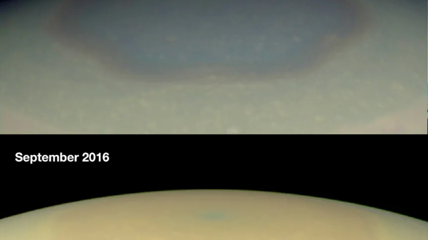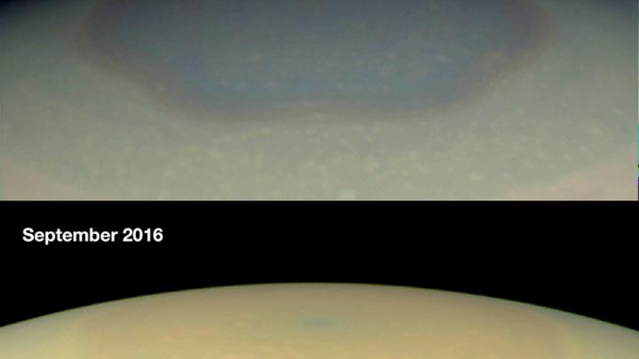 NASA pokazała na swojej stronie internetowej dwa zdjęcia Saturna pokazujące obszar wokół północnego bieguna planety. Jedno z 2012 roku, a drugie z roku 2016. Oba wykonano w naturalnych kolorach. Porównanie fotografii wskazuje, że zmienia się kolor atmosfery na obszarze w pobliżu bieguna północnego.
