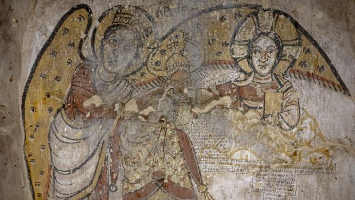 "Malowidła ukazują Matkę Boską, Chrystusa, a także scenę prezentującą króla nubijskiego, Chrystusa i archanioła Michała. Nie jest to jednak typowe przedstawienie protekcji władcy nubijskiego przez świętych i archaniołów" - zwraca uwagę CAŚ w przesłanym PAP komunikacie. Jak opisują badacze, "król kłania się zasiadającemu na obłokach Chrystusowi całując jego dłoń. Władcę wspiera archanioł Michał, którego rozłożone skrzydła otaczają opieką zarówno króla, jak i samego Chrystusa".