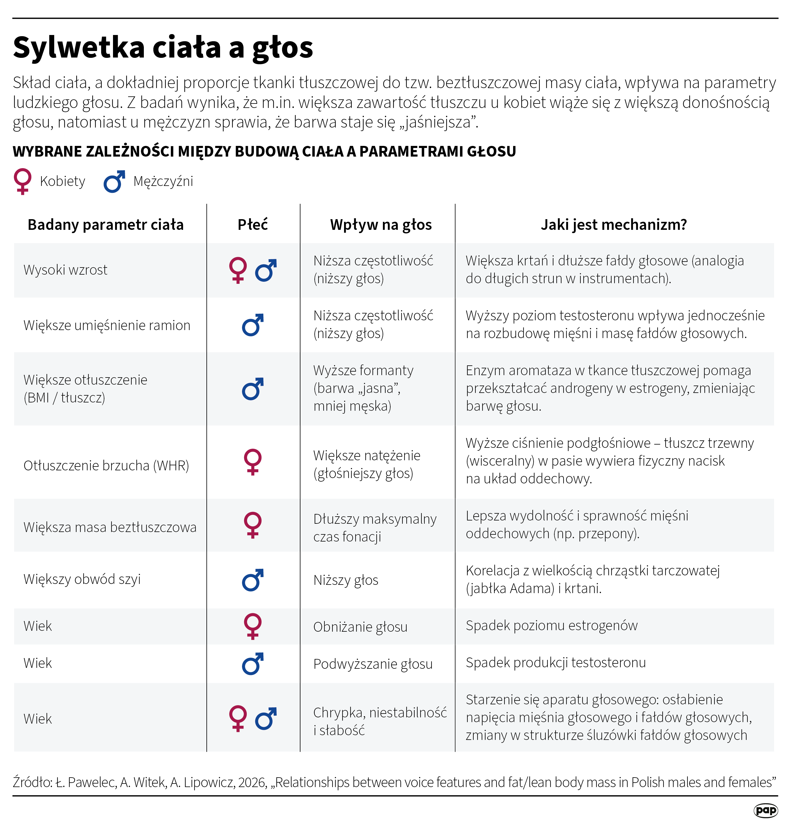 Skład ciała, a dokładniej proporcje tkanki tłuszczowej do tzw. beztłuszczowej masy ciała, wpływa na parametry ludzkiego głosu. Większa zawartość tłuszczu u kobiet wiąże się z większą donośnością głosu, natomiast u mężczyzn sprawia, że barwa staje się „jaśniejsza” – wynika z badań polskiego antropologa.