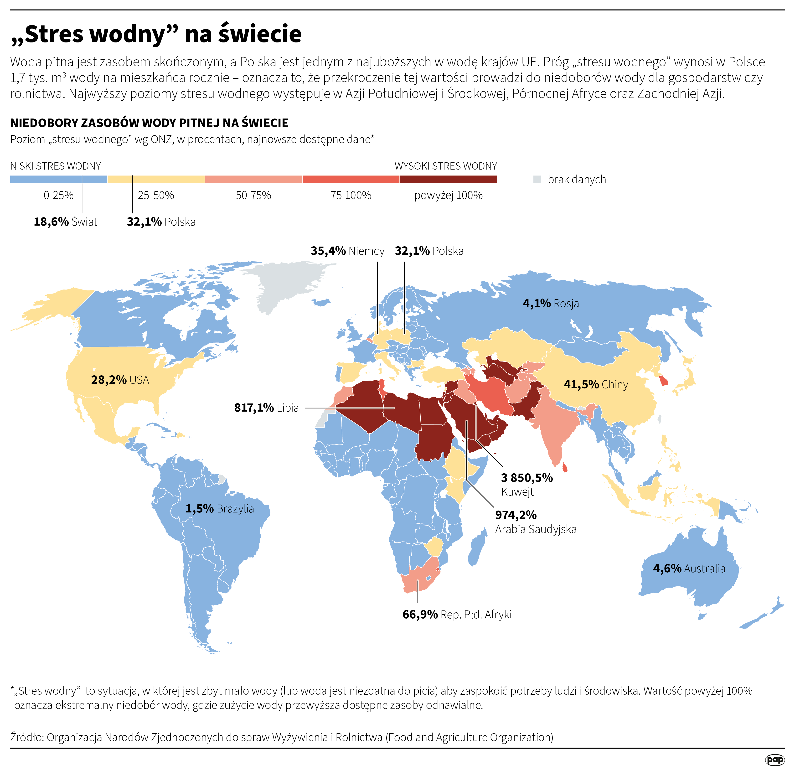 Jak oceniają eksperci zajmujący się zasobami wodnymi, w Polsce od co najmniej dekady żyjemy na „wodnym kredycie” – odprowadzamy wodę z kraju szybciej, niż natura jest w stanie ją uzupełnić. Według ONZ próg „stresu wodnego” wynosi 1,7 tys. m3 wody na mieszkańca rocznie. W Polsce średnia to zaledwie 1,6 tys. m3, a w latach suchych wskaźnik ten spada do krytycznych 1,1 tys. m3. Dlatego nasz kraj jest uważany za jeden z najuboższych w wodę krajów Unii Europejskiej.
